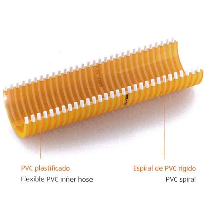 Manguera de PVC con’espiral de PVC rígido, para impulsión y aspiración de líquidos alimentarios en aplicaciones severas.